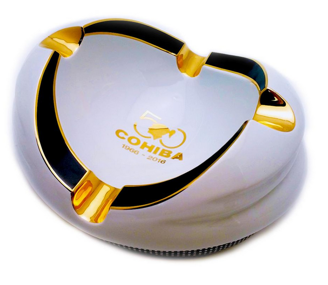 Designed to accommodate four larger ring gauge cigars, it features a deep bowl for ash disposal, ensuring a clean and tidy smoking environment. What sets this ashtray apart is its interior design, which pays homage to Cohiba's 50 years of excellence in the cigar industry.