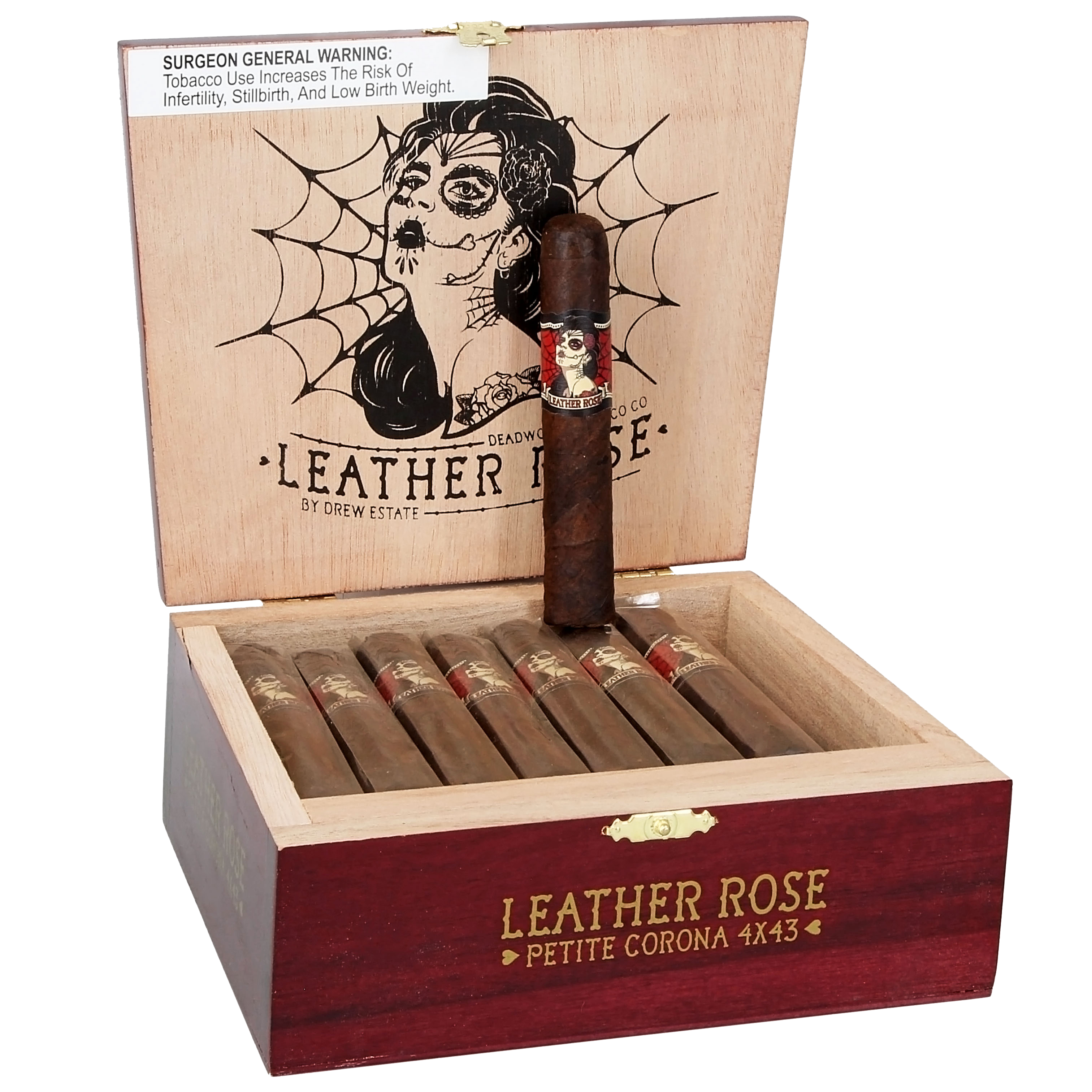 The Deadwood Tobacco Co. Leather Rose Petite Corona cigars are the result of a partnership between Deadwood's Vaughn Boyd and the renowned Drew Estate Company. This slender 4 x 43 cigar is carefully crafted at Drew Estate's Nicaraguan factory, featuring a dark, oily Maduro wrapper that encases a blend of aromatic, exotic tobaccos to highlight the cigar's natural sweetness. Medium-to-full-bodied, it offers an intriguing flavor profile with notes of anise, pepper, earth, dried fruit, and subtle floral hints. The Leather Rose Petite Corona delivers a unique and delicious experience that exemplifies Drew Estate’s craftsmanship. Grab a box of 24 from Leisure Time Cigars today and savor this exceptional blend.