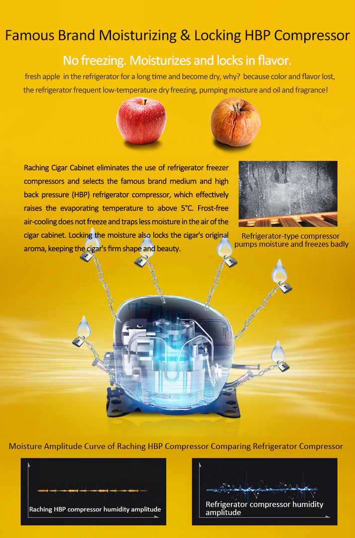 This striking yellow humidor is more than just a fashionable conversation piece - it's also the first cigar cabinet in the world to create an oak medium with constant temperature and humidity! Imported North American oak serves as both shelves and interior liner, allowing the cigars to experience the same natural benefits of barrel-fermented cigars: a mellower mouthfeel, richer aroma, deeper flavor, and higher smoke levels! The exterior boasts a classic COHIBA high-gloss yellow piano finish with sleek craftsmanship and invisible back cooling components for a minimalist touch. The smooth double-arc chamfered door sets itself apart from traditional cigar cabinet's sharp corners and edges with stylish curves that stand out by blending in. A self-contained refrigeration black box collects all of the condensation within to fully separate moisture, and the HBP compressor provides frost-free air-cooling to trap less moisture and lock in the aroma, flavor, and firm shape and beauty of your cigars! A “Geothermal” PTC thermal compensation system avoids the typical trappings of uneven humidifying by simulating home underfloor heating, allowing hot air to naturally rise and leading to a humidity variation level of less than 2% between top and bottom of the cabinet.