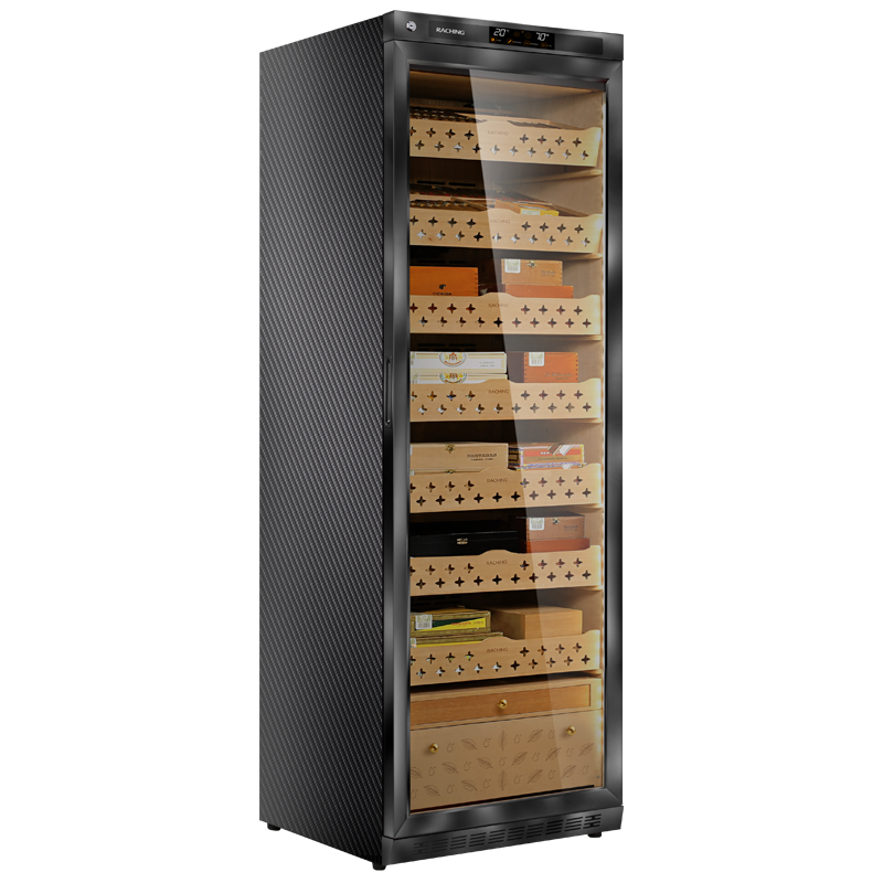 Discover the Raching MON3800A Humidor, a pinnacle of precision and sophistication in cigar storage. Since 2004, Raching has been synonymous with luxury and innovation in climate-controlled storage solutions. The MON3800A features an advanced climate control system, including built-in humidity regulation, fan cooling, heating, and de-humidification, allowing you to effortlessly maintain the ideal conditions of 70% humidity and 70°F temperature, or customize to your preference via the intuitive exterior LCD panel.