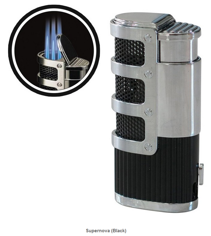 Take your cigar-smoking ritual up a notch, with the Supernova Triple Flame Torch Lighter in classic black. Highly rated by enthusiasts for its performance and style, this lighter combines functionality with luxury, making it the perfect accessory for discerning cigar lovers.